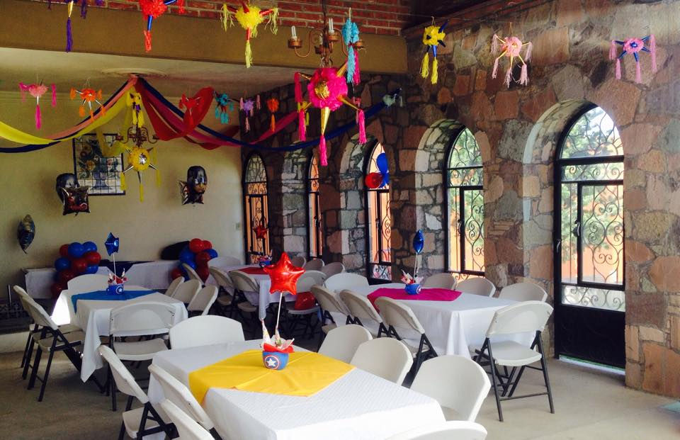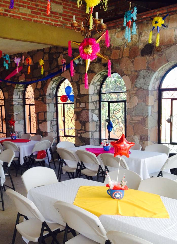 El servicio incluye: Sillas y Mesas para adultos y especiales para niños. Mantelería en amplia gama de colores. Rocola musical karaoke. Juego infantil inflable. Estacionamiento .
